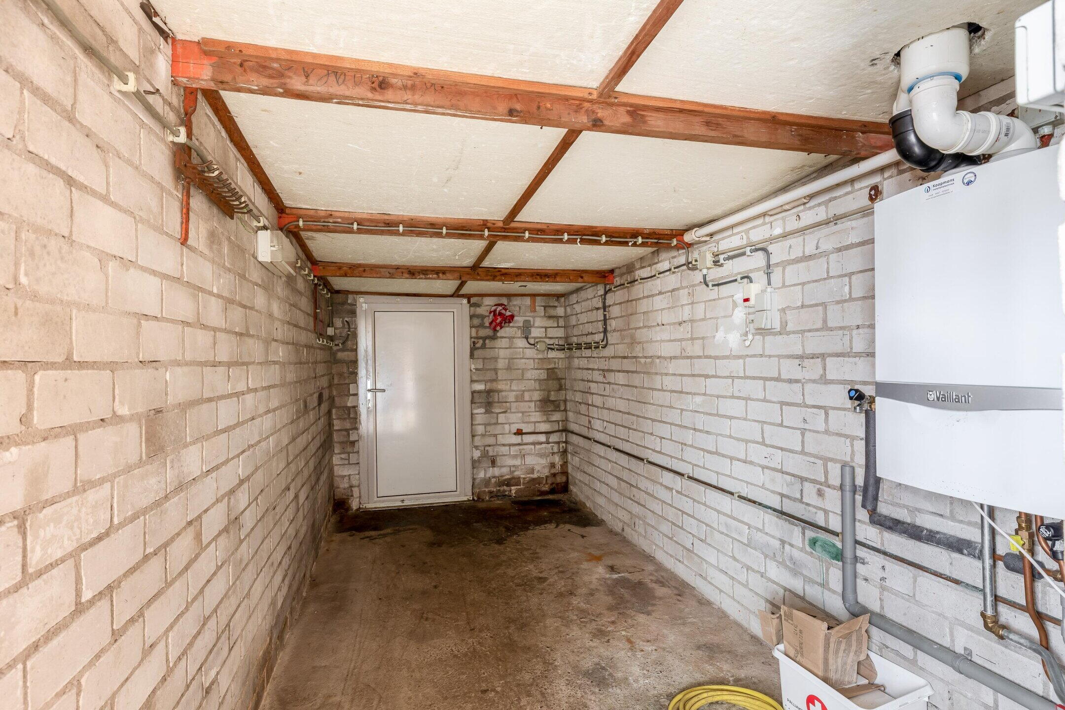 entree, hal met gecombineerde kelder-/meterkast, eenvoudig toilet met fontein, woonkamer met openslaande deuren naar de achtertuin, open keuken met standaard keukenblok in aanbouw van kamer naar berging. Tevens toegang tot de achtertuin.